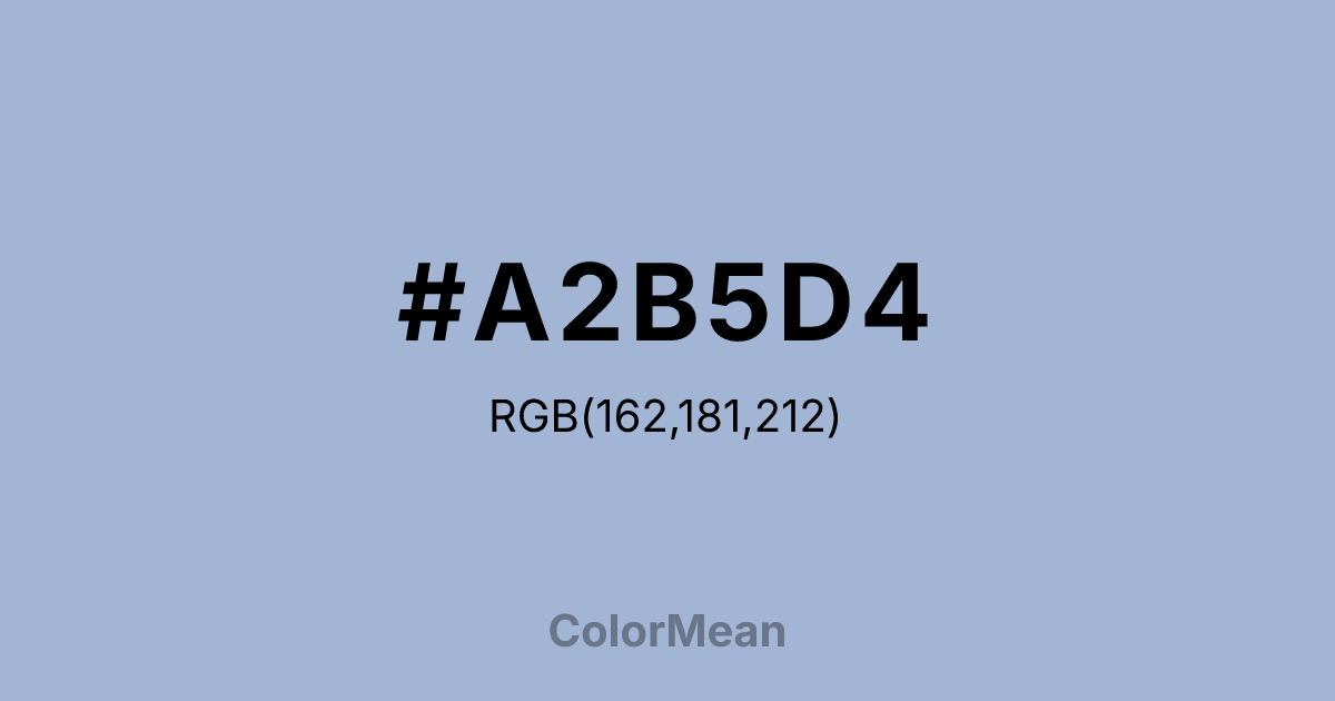 #A2B5D4 RGB value is (162, 181, 212). The hex color red value is 162, green is 181, and blue is 212. Its HSL format shows a hue of 217°, saturation of 37 percent, and lightness of 73 percent. The CMYK process values are 24 percent, 15 percent, 0 percent, 17 percent.