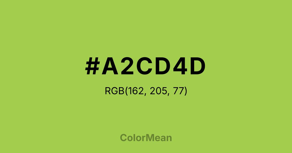 #A2CD4D RGB value is (162, 205, 77). The hex color red value is 162, green is 205, and blue is 77. Its HSL format shows a hue of 80°, saturation of 56 percent, and lightness of 55 percent. The CMYK process values are 21 percent, 0 percent, 62 percent, 20 percent.