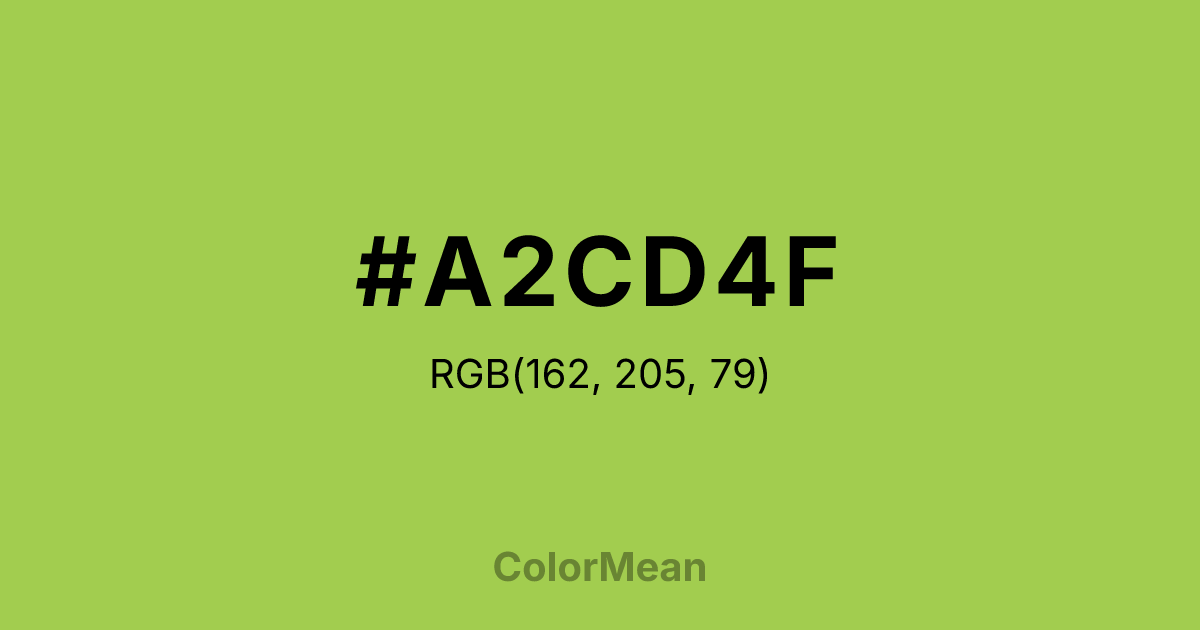 #A2CD4F RGB value is (162, 205, 79). The hex color red value is 162, green is 205, and blue is 79. Its HSL format shows a hue of 80°, saturation of 56 percent, and lightness of 56 percent. The CMYK process values are 21 percent, 0 percent, 61 percent, 20 percent.
