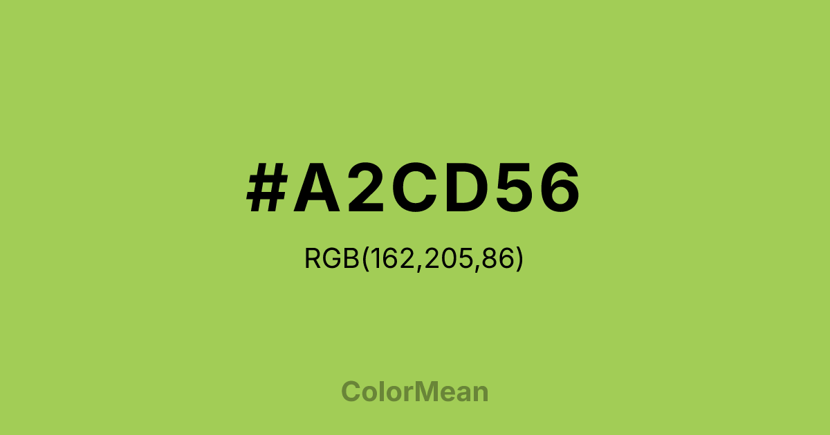 #A2CD56 RGB value is (162, 205, 86). The hex color red value is 162, green is 205, and blue is 86. Its HSL format shows a hue of 82°, saturation of 54 percent, and lightness of 57 percent. The CMYK process values are 21 percent, 0 percent, 58 percent, 20 percent.