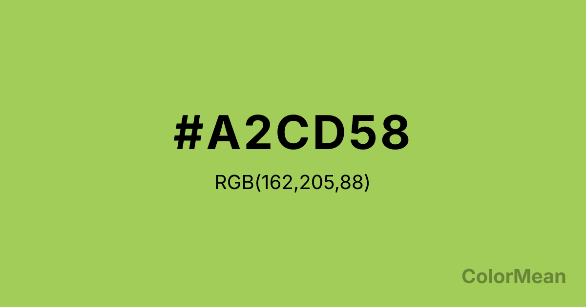 #A2CD58 RGB value is (162, 205, 88). The hex color red value is 162, green is 205, and blue is 88. Its HSL format shows a hue of 82°, saturation of 54 percent, and lightness of 57 percent. The CMYK process values are 21 percent, 0 percent, 57 percent, 20 percent.