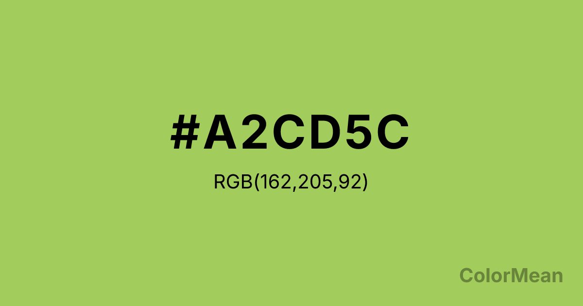 #A2CD5C RGB value is (162, 205, 92). The hex color red value is 162, green is 205, and blue is 92. Its HSL format shows a hue of 83°, saturation of 53 percent, and lightness of 58 percent. The CMYK process values are 21 percent, 0 percent, 55 percent, 20 percent.