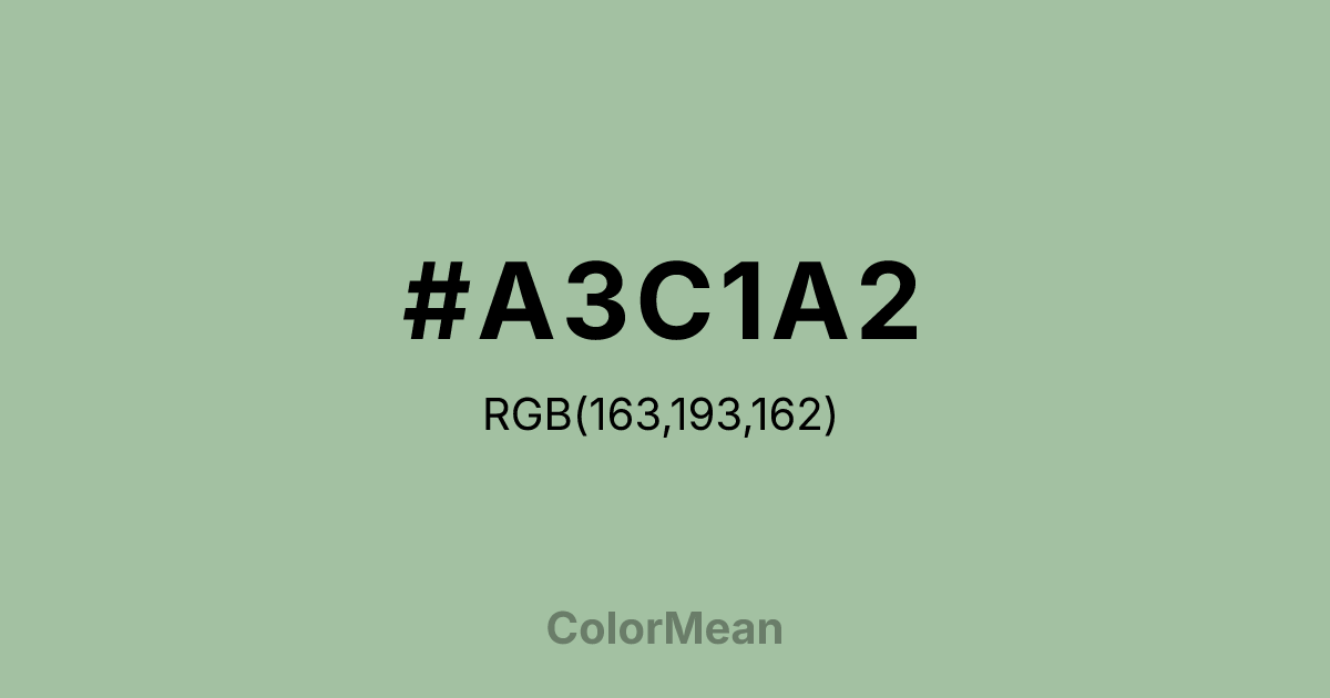 #A3C1A2 RGB value is (163, 193, 162). The hex color red value is 163, green is 193, and blue is 162. Its HSL format shows a hue of 118°, saturation of 20 percent, and lightness of 70 percent. The CMYK process values are 16 percent, 0 percent, 16 percent, 24 percent.