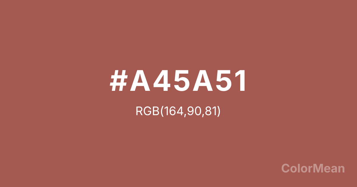 #A45A51 RGB value is (164, 90, 81). The hex color red value is 164, green is 90, and blue is 81. Its HSL format shows a hue of 7°, saturation of 34 percent, and lightness of 48 percent. The CMYK process values are 0 percent, 45 percent, 51 percent, 36 percent.