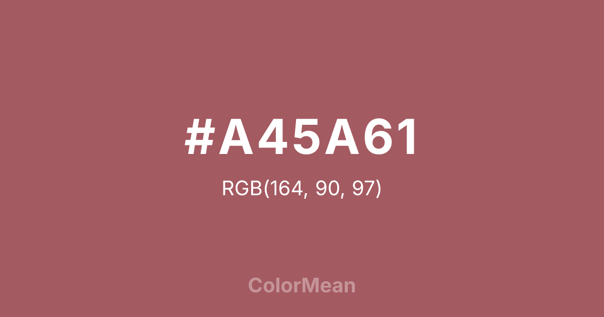 #A45A61 RGB value is (164, 90, 97). The hex color red value is 164, green is 90, and blue is 97. Its HSL format shows a hue of 354°, saturation of 29 percent, and lightness of 50 percent. The CMYK process values are 0 percent, 45 percent, 41 percent, 36 percent.