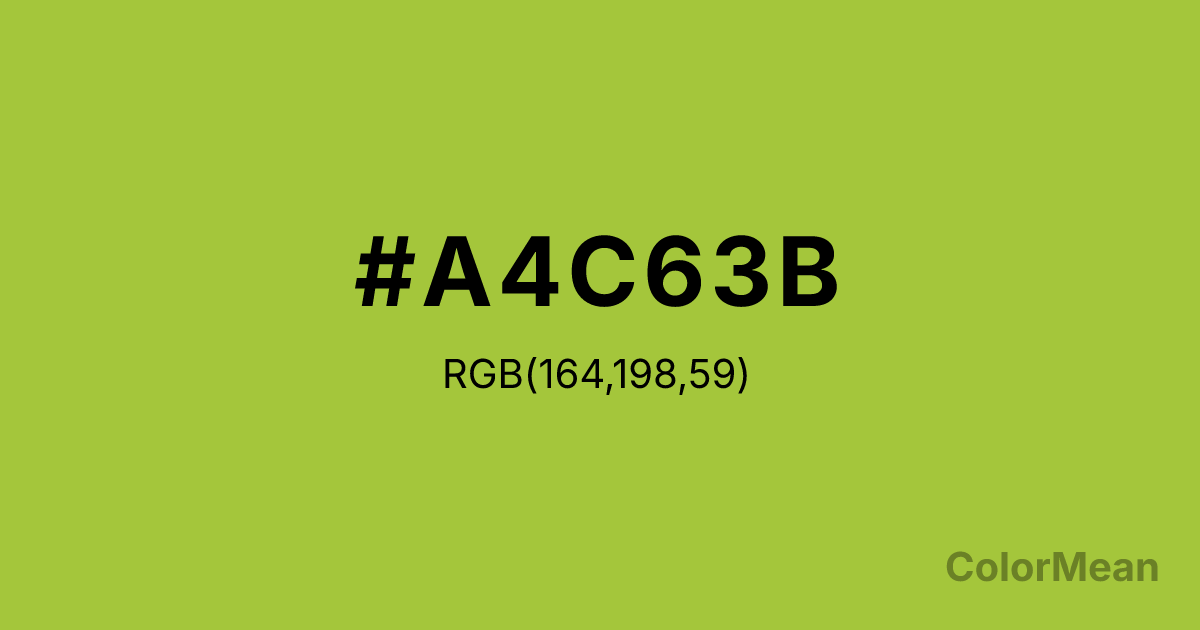 #A4C63B RGB value is (164, 198, 59). The hex color red value is 164, green is 198, and blue is 59. Its HSL format shows a hue of 75°, saturation of 55 percent, and lightness of 50 percent. The CMYK process values are 17 percent, 0 percent, 70 percent, 22 percent.