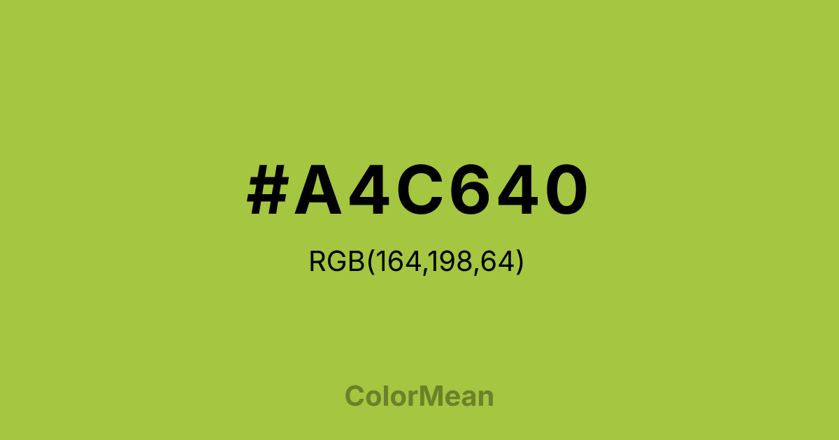 #A4C640 RGB value is (164, 198, 64). The hex color red value is 164, green is 198, and blue is 64. Its HSL format shows a hue of 75°, saturation of 54 percent, and lightness of 51 percent. The CMYK process values are 17 percent, 0 percent, 68 percent, 22 percent.