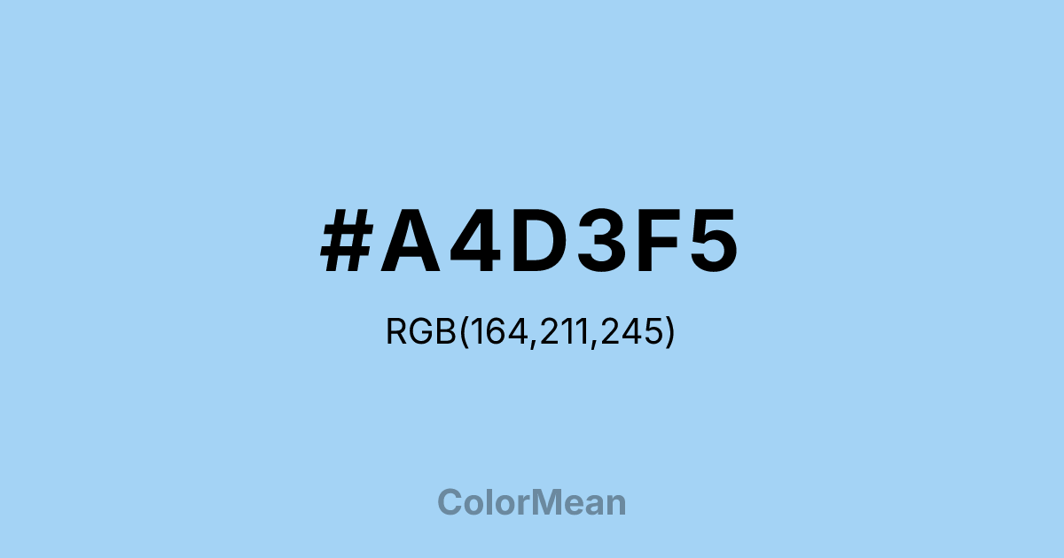 #A4D3F5 RGB value is (164, 211, 245). The hex color red value is 164, green is 211, and blue is 245. Its HSL format shows a hue of 205°, saturation of 80 percent, and lightness of 80 percent. The CMYK process values are 33 percent, 14 percent, 0 percent, 4 percent.