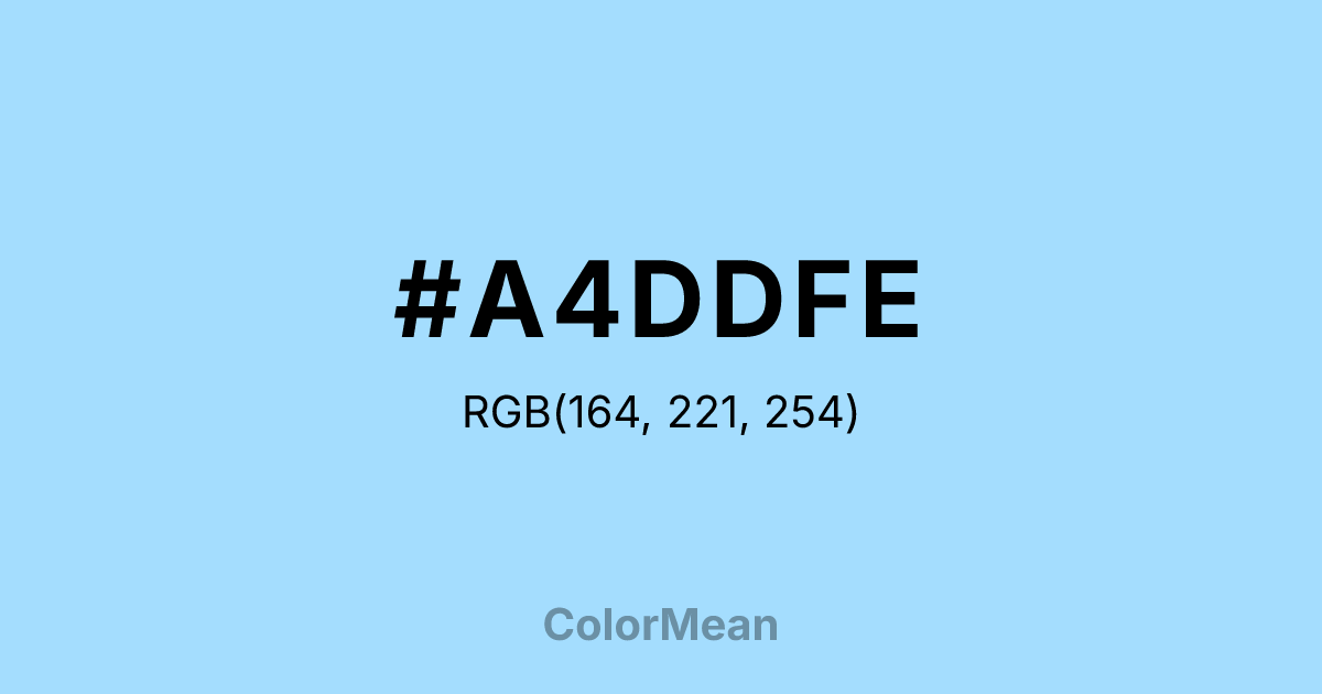 #A4DDFE RGB value is (164, 221, 254). The hex color red value is 164, green is 221, and blue is 254. Its HSL format shows a hue of 202°, saturation of 98 percent, and lightness of 82 percent. The CMYK process values are 35 percent, 13 percent, 0 percent, 0 percent.