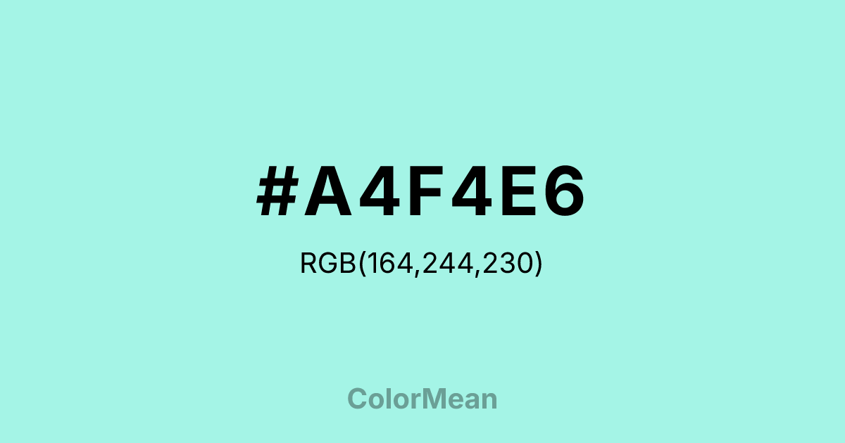 #A4F4E6 RGB value is (164, 244, 230). The hex color red value is 164, green is 244, and blue is 230. Its HSL format shows a hue of 170°, saturation of 78 percent, and lightness of 80 percent. The CMYK process values are 33 percent, 0 percent, 6 percent, 4 percent.