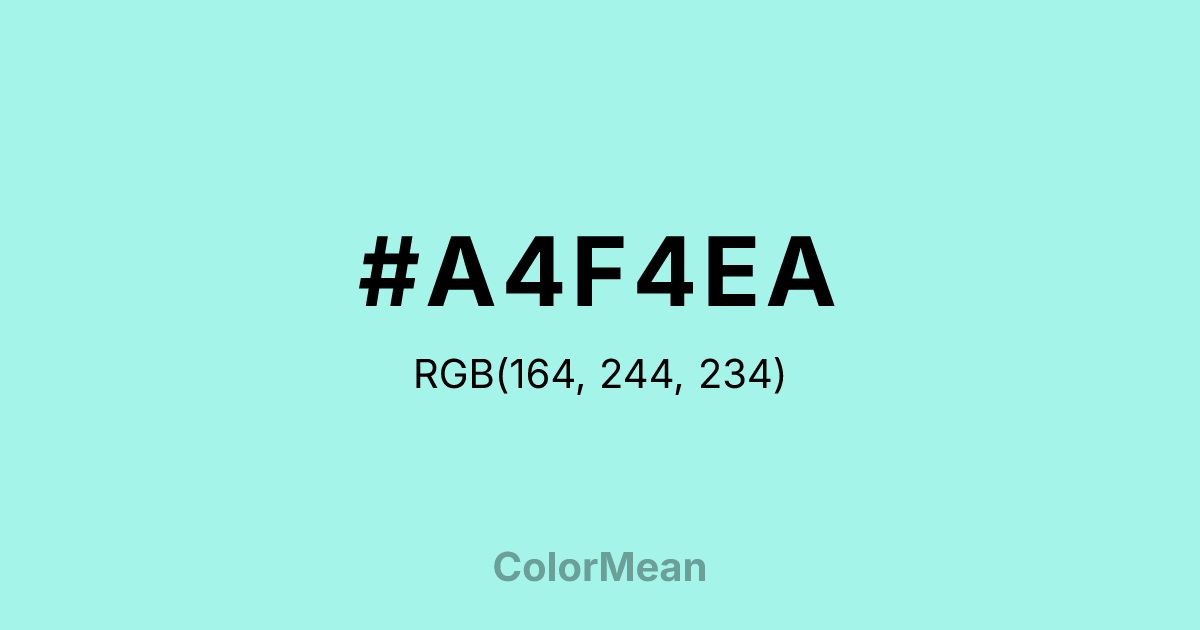 #A4F4EA RGB value is (164, 244, 234). The hex color red value is 164, green is 244, and blue is 234. Its HSL format shows a hue of 173°, saturation of 78 percent, and lightness of 80 percent. The CMYK process values are 33 percent, 0 percent, 4 percent, 4 percent.