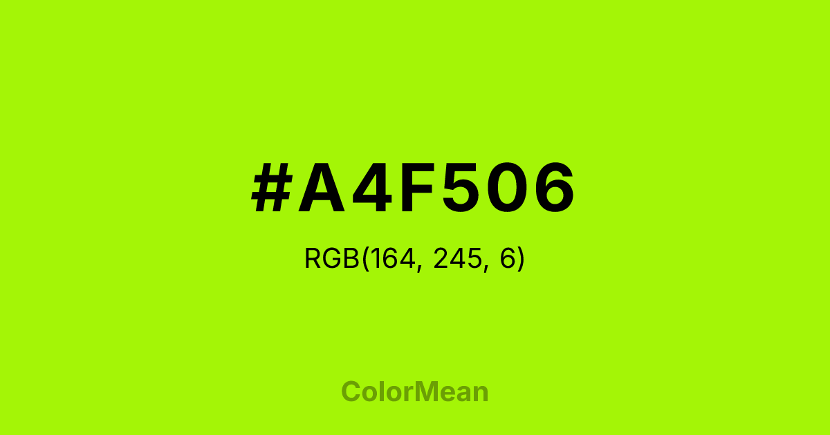 #A4F506 RGB value is (164, 245, 6). The hex color red value is 164, green is 245, and blue is 6. Its HSL format shows a hue of 80°, saturation of 95 percent, and lightness of 49 percent. The CMYK process values are 33 percent, 0 percent, 98 percent, 4 percent.