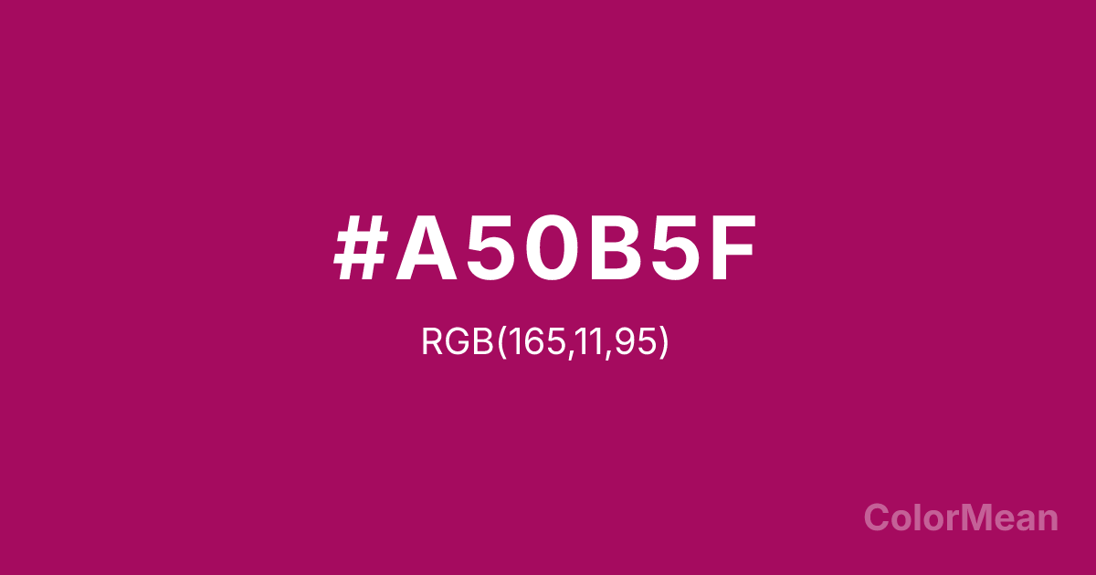 #A50B5F RGB value is (165, 11, 95). The hex color red value is 165, green is 11, and blue is 95. Its HSL format shows a hue of 327°, saturation of 88 percent, and lightness of 35 percent. The CMYK process values are 0 percent, 93 percent, 42 percent, 35 percent.