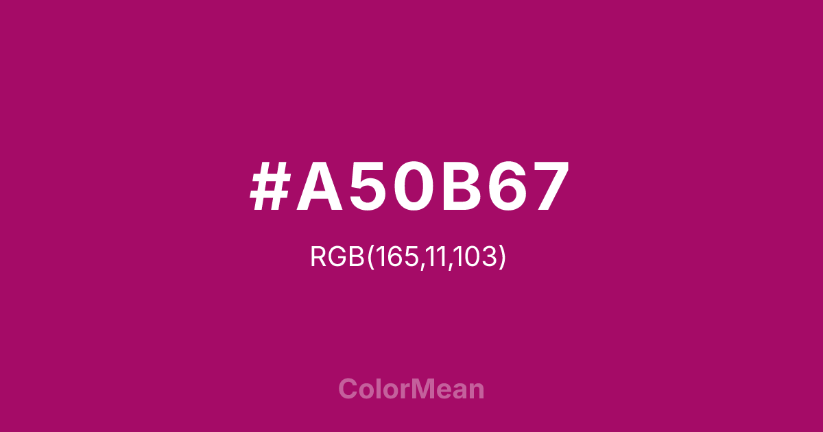 #A50B67 RGB value is (165, 11, 103). The hex color red value is 165, green is 11, and blue is 103. Its HSL format shows a hue of 324°, saturation of 88 percent, and lightness of 35 percent. The CMYK process values are 0 percent, 93 percent, 38 percent, 35 percent.