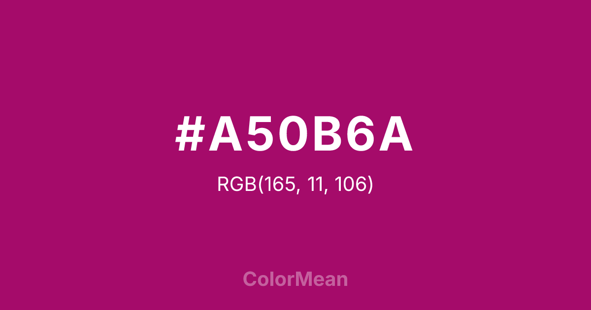 #A50B6A RGB value is (165, 11, 106). The hex color red value is 165, green is 11, and blue is 106. Its HSL format shows a hue of 323°, saturation of 88 percent, and lightness of 35 percent. The CMYK process values are 0 percent, 93 percent, 36 percent, 35 percent.