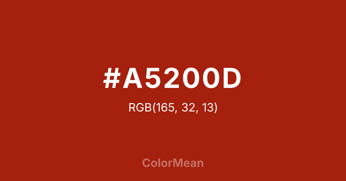 #A5200D RGB value is (165, 32, 13). The hex color red value is 165, green is 32, and blue is 13. Its HSL format shows a hue of 8°, saturation of 85 percent, and lightness of 35 percent. The CMYK process values are 0 percent, 81 percent, 92 percent, 35 percent.