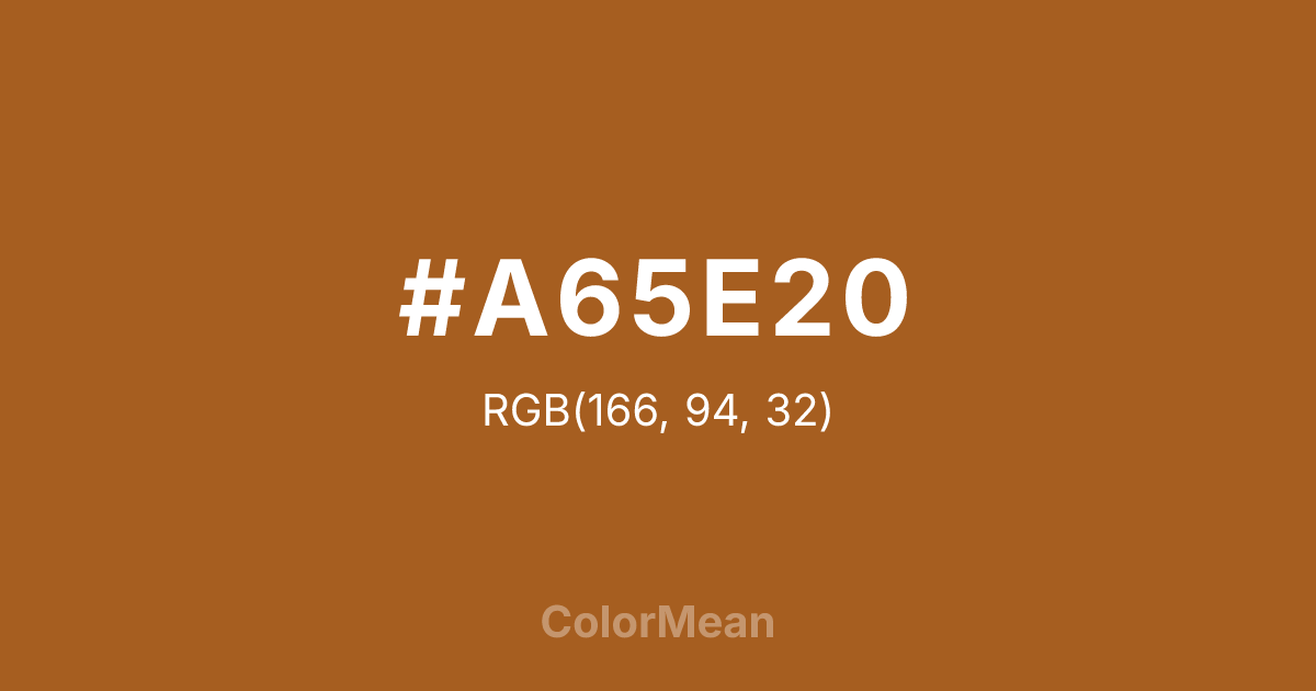 #A65E20 RGB value is (166, 94, 32). The hex color red value is 166, green is 94, and blue is 32. Its HSL format shows a hue of 28°, saturation of 68 percent, and lightness of 39 percent. The CMYK process values are 0 percent, 43 percent, 81 percent, 35 percent.