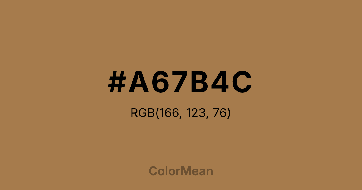 #A67B4C RGB value is (166, 123, 76). The hex color red value is 166, green is 123, and blue is 76. Its HSL format shows a hue of 31°, saturation of 37 percent, and lightness of 47 percent. The CMYK process values are 0 percent, 26 percent, 54 percent, 35 percent.