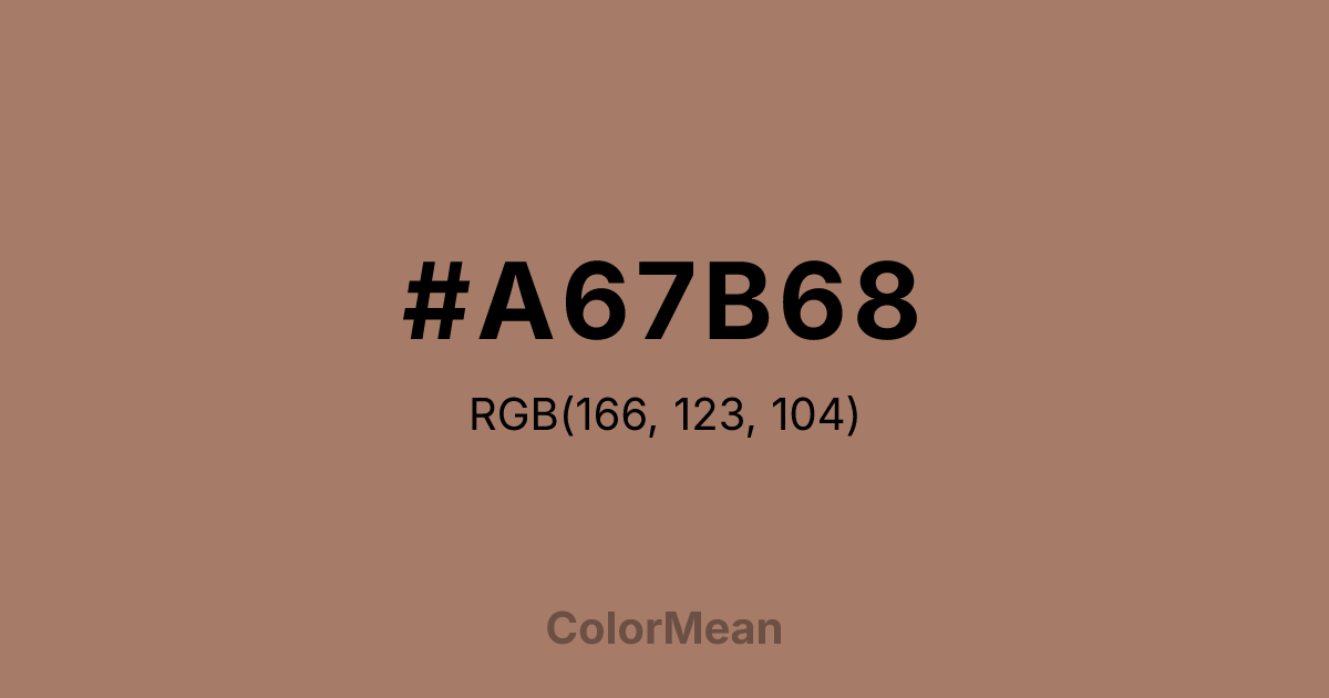 #A67B68 RGB value is (166, 123, 104). The hex color red value is 166, green is 123, and blue is 104. Its HSL format shows a hue of 18°, saturation of 26 percent, and lightness of 53 percent. The CMYK process values are 0 percent, 26 percent, 37 percent, 35 percent.