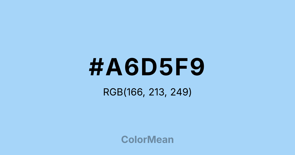 #A6D5F9 RGB value is (166, 213, 249). The hex color red value is 166, green is 213, and blue is 249. Its HSL format shows a hue of 206°, saturation of 87 percent, and lightness of 81 percent. The CMYK process values are 33 percent, 14 percent, 0 percent, 2 percent.
