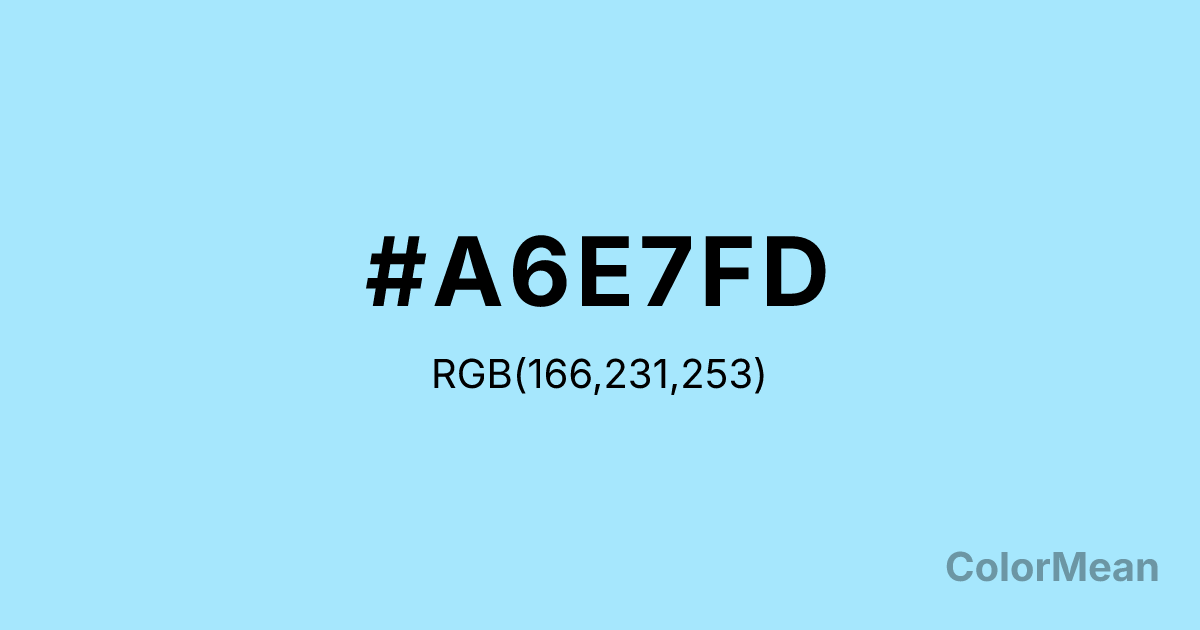#A6E7FD RGB value is (166, 231, 253). The hex color red value is 166, green is 231, and blue is 253. Its HSL format shows a hue of 195°, saturation of 96 percent, and lightness of 82 percent. The CMYK process values are 34 percent, 9 percent, 0 percent, 1 percent.