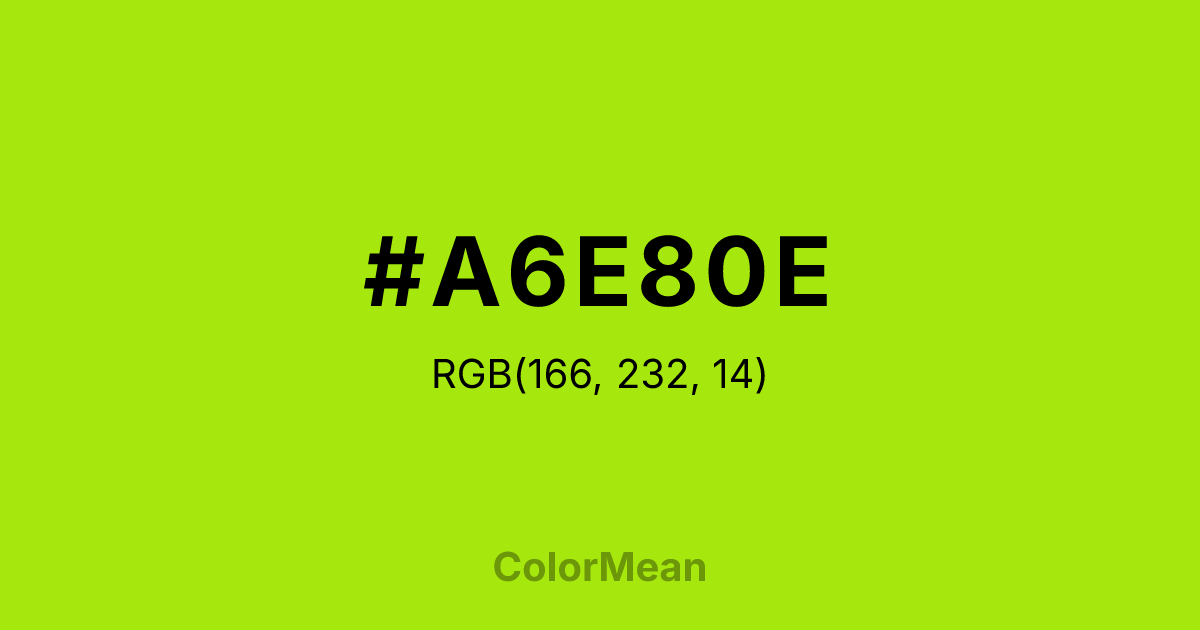 #A6E80E RGB value is (166, 232, 14). The hex color red value is 166, green is 232, and blue is 14. Its HSL format shows a hue of 78°, saturation of 89 percent, and lightness of 48 percent. The CMYK process values are 28 percent, 0 percent, 94 percent, 9 percent.