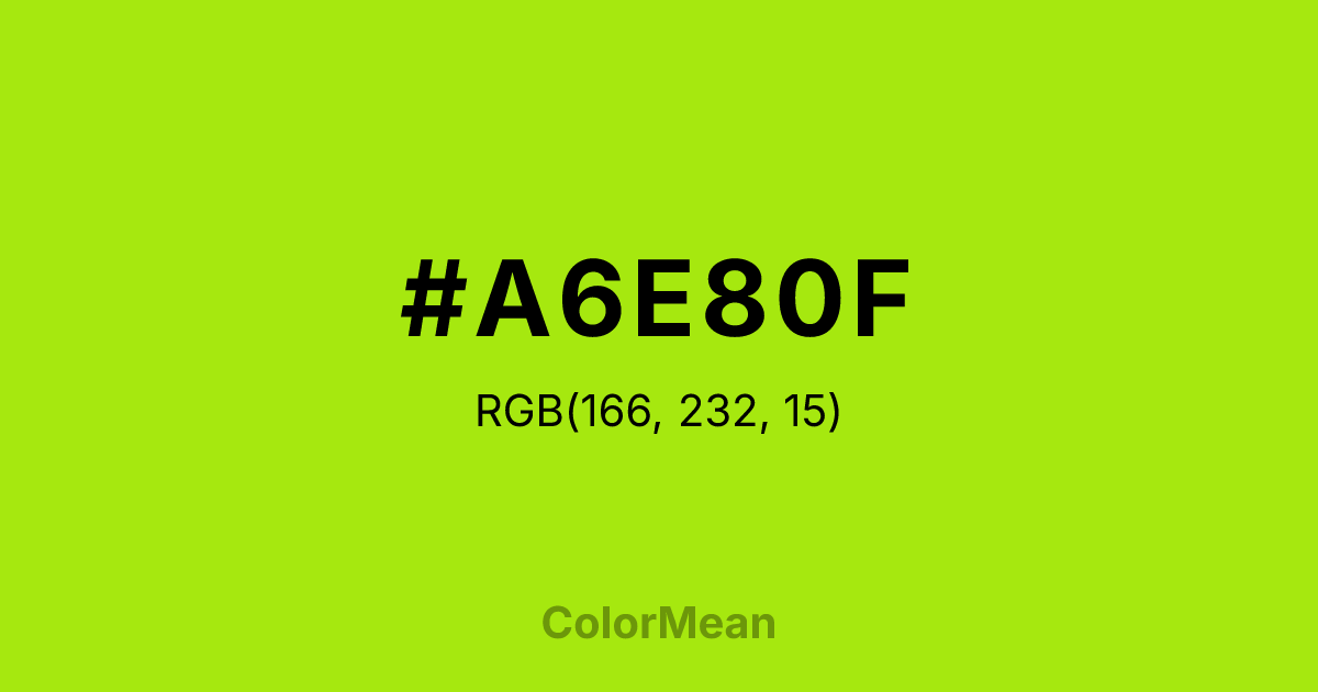 #A6E80F RGB value is (166, 232, 15). The hex color red value is 166, green is 232, and blue is 15. Its HSL format shows a hue of 78°, saturation of 88 percent, and lightness of 48 percent. The CMYK process values are 28 percent, 0 percent, 94 percent, 9 percent.