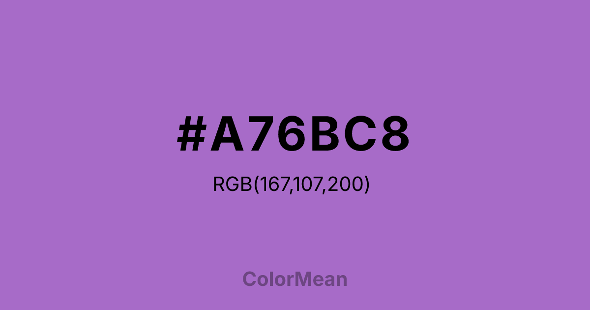 #A76BC8 RGB value is (167, 107, 200). The hex color red value is 167, green is 107, and blue is 200. Its HSL format shows a hue of 279°, saturation of 46 percent, and lightness of 60 percent. The CMYK process values are 16 percent, 46 percent, 0 percent, 22 percent.
