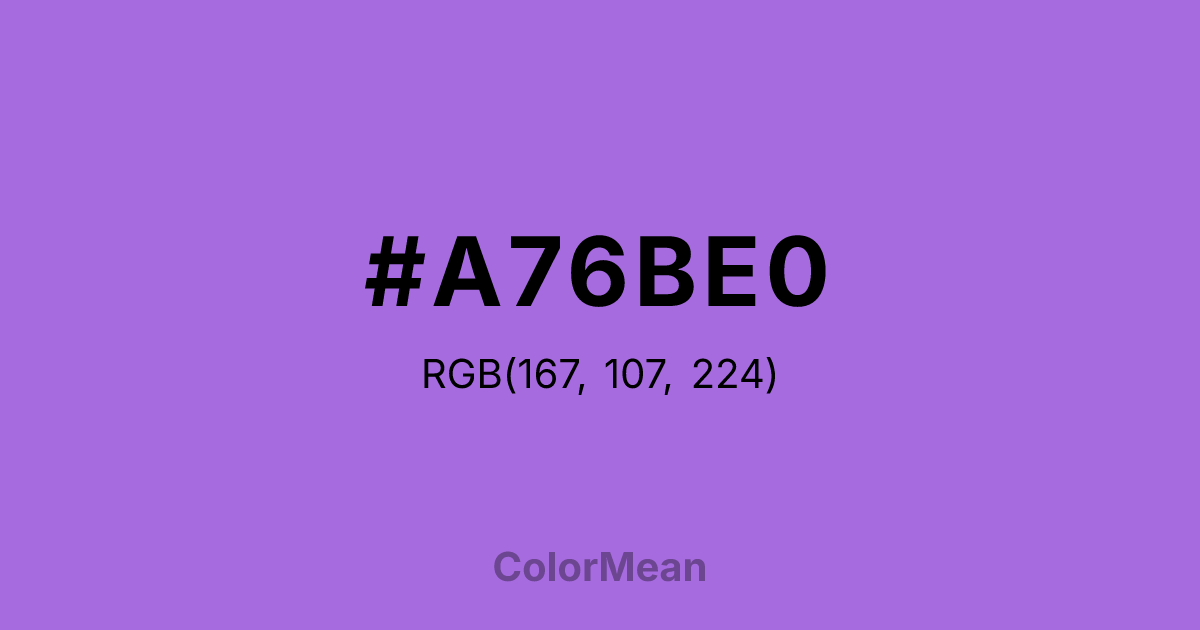 #A76BE0 RGB value is (167, 107, 224). The hex color red value is 167, green is 107, and blue is 224. Its HSL format shows a hue of 271°, saturation of 65 percent, and lightness of 65 percent. The CMYK process values are 25 percent, 52 percent, 0 percent, 12 percent.