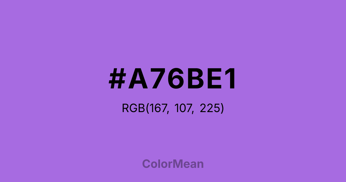 #A76BE1 RGB value is (167, 107, 225). The hex color red value is 167, green is 107, and blue is 225. Its HSL format shows a hue of 271°, saturation of 66 percent, and lightness of 65 percent. The CMYK process values are 26 percent, 52 percent, 0 percent, 12 percent.