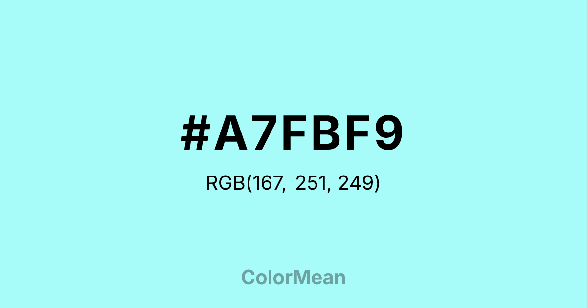 #A7FBF9 RGB value is (167, 251, 249). The hex color red value is 167, green is 251, and blue is 249. Its HSL format shows a hue of 179°, saturation of 91 percent, and lightness of 82 percent. The CMYK process values are 33 percent, 0 percent, 1 percent, 2 percent.