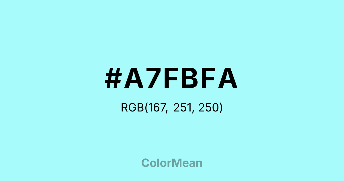 #A7FBFA RGB value is (167, 251, 250). The hex color red value is 167, green is 251, and blue is 250. Its HSL format shows a hue of 179°, saturation of 91 percent, and lightness of 82 percent. The CMYK process values are 33 percent, 0 percent, 0 percent, 2 percent.