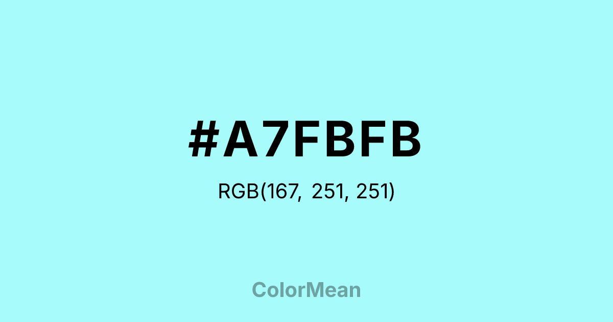 #A7FBFB RGB value is (167, 251, 251). The hex color red value is 167, green is 251, and blue is 251. Its HSL format shows a hue of 180°, saturation of 91 percent, and lightness of 82 percent. The CMYK process values are 33 percent, 0 percent, 0 percent, 2 percent.