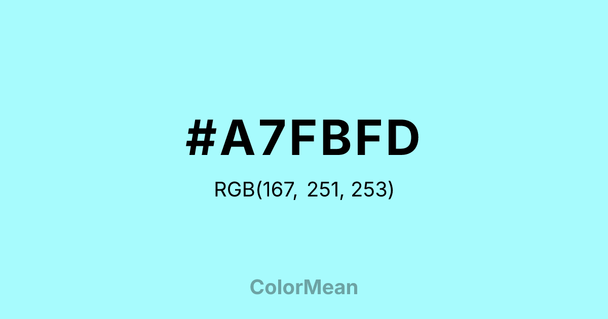 #A7FBFD RGB value is (167, 251, 253). The hex color red value is 167, green is 251, and blue is 253. Its HSL format shows a hue of 181°, saturation of 96 percent, and lightness of 82 percent. The CMYK process values are 34 percent, 1 percent, 0 percent, 1 percent.