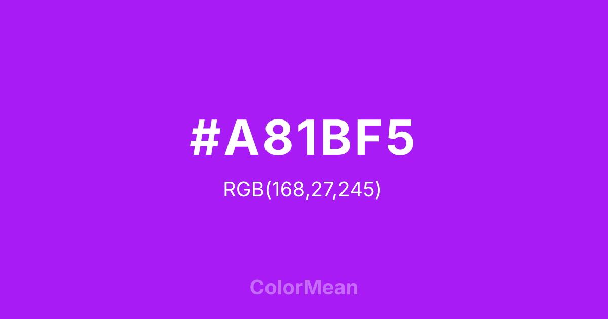 #A81BF5 RGB value is (168, 27, 245). The hex color red value is 168, green is 27, and blue is 245. Its HSL format shows a hue of 279°, saturation of 92 percent, and lightness of 53 percent. The CMYK process values are 31 percent, 89 percent, 0 percent, 4 percent.