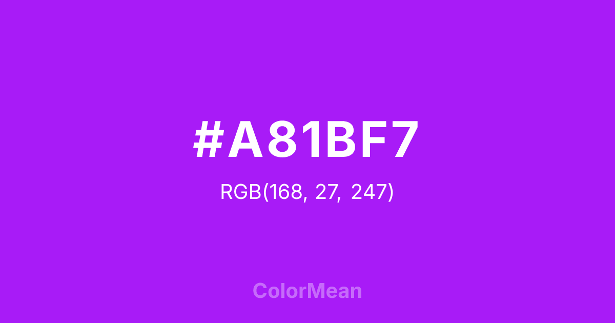 #A81BF7 RGB value is (168, 27, 247). The hex color red value is 168, green is 27, and blue is 247. Its HSL format shows a hue of 278°, saturation of 93 percent, and lightness of 54 percent. The CMYK process values are 32 percent, 89 percent, 0 percent, 3 percent.