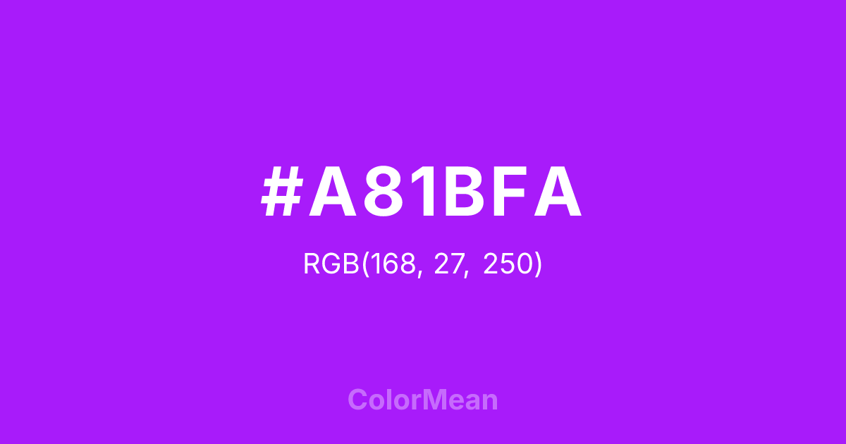 #A81BFA RGB value is (168, 27, 250). The hex color red value is 168, green is 27, and blue is 250. Its HSL format shows a hue of 278°, saturation of 96 percent, and lightness of 54 percent. The CMYK process values are 33 percent, 89 percent, 0 percent, 2 percent.