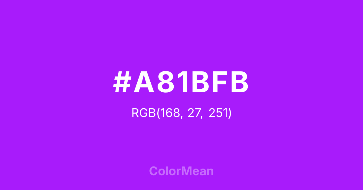 #A81BFB RGB value is (168, 27, 251). The hex color red value is 168, green is 27, and blue is 251. Its HSL format shows a hue of 278°, saturation of 97 percent, and lightness of 55 percent. The CMYK process values are 33 percent, 89 percent, 0 percent, 2 percent.