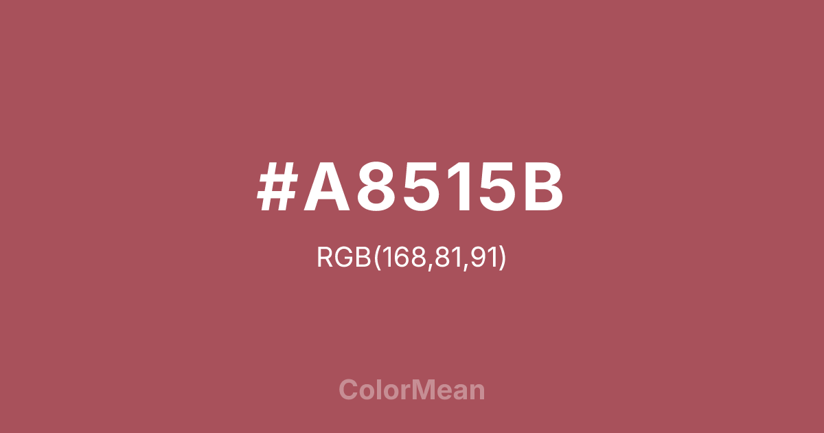 #A8515B RGB value is (168, 81, 91). The hex color red value is 168, green is 81, and blue is 91. Its HSL format shows a hue of 353°, saturation of 35 percent, and lightness of 49 percent. The CMYK process values are 0 percent, 52 percent, 46 percent, 34 percent.