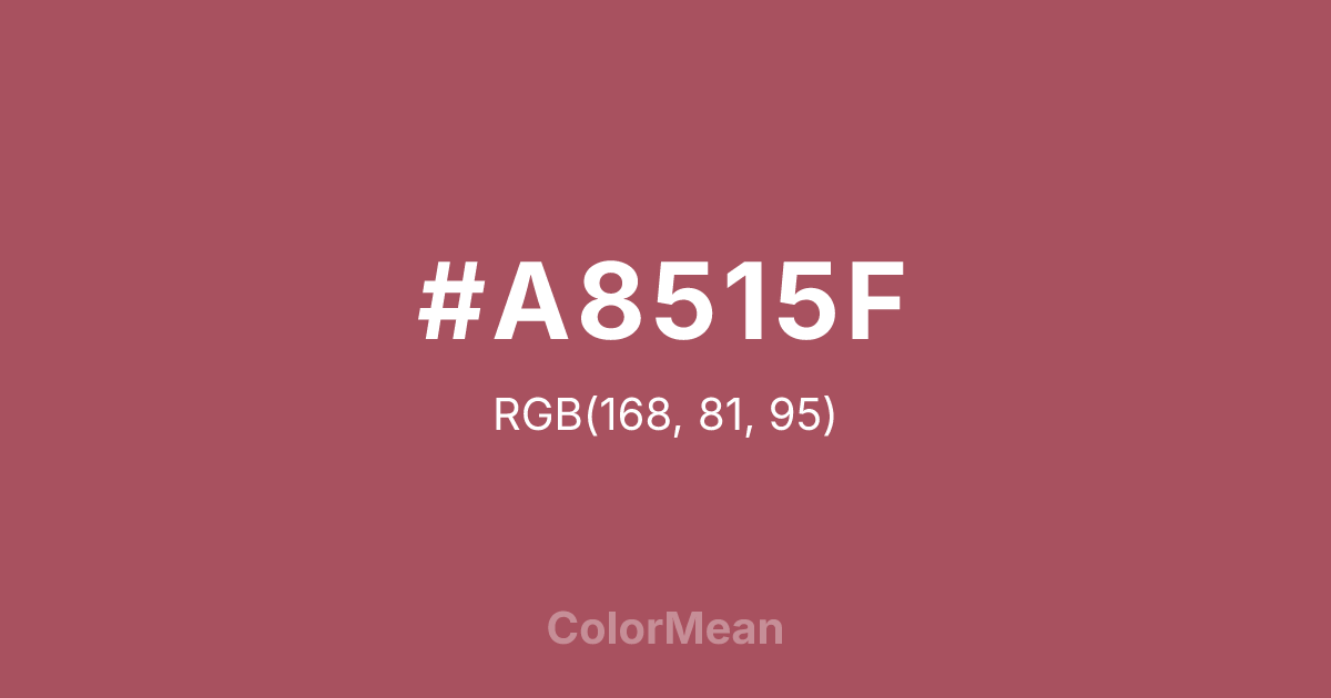 #A8515F RGB value is (168, 81, 95). The hex color red value is 168, green is 81, and blue is 95. Its HSL format shows a hue of 350°, saturation of 35 percent, and lightness of 49 percent. The CMYK process values are 0 percent, 52 percent, 43 percent, 34 percent.