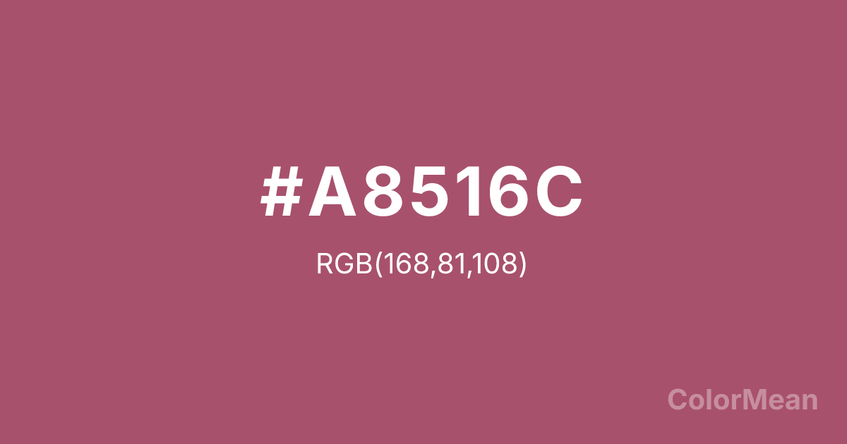 #A8516C RGB value is (168, 81, 108). The hex color red value is 168, green is 81, and blue is 108. Its HSL format shows a hue of 341°, saturation of 35 percent, and lightness of 49 percent. The CMYK process values are 0 percent, 52 percent, 36 percent, 34 percent.