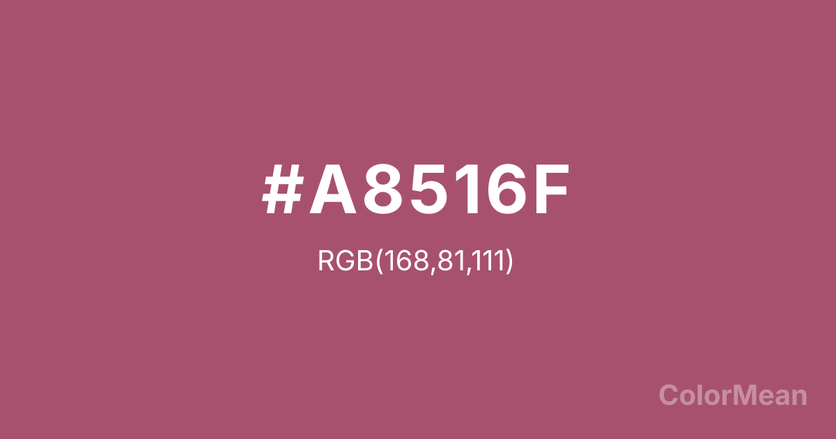 #A8516F RGB value is (168, 81, 111). The hex color red value is 168, green is 81, and blue is 111. Its HSL format shows a hue of 339°, saturation of 35 percent, and lightness of 49 percent. The CMYK process values are 0 percent, 52 percent, 34 percent, 34 percent.