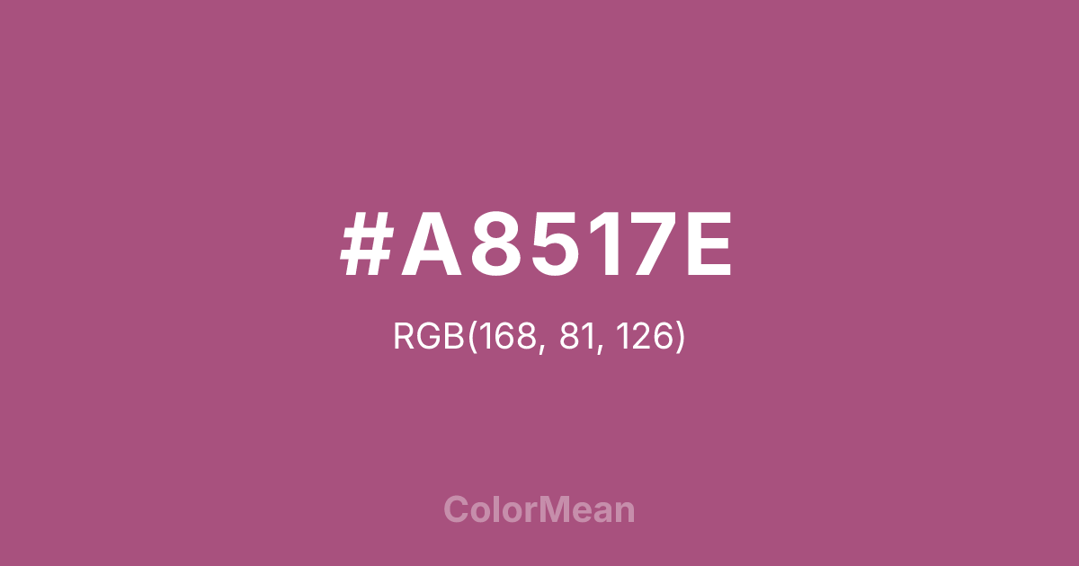 #A8517E RGB value is (168, 81, 126). The hex color red value is 168, green is 81, and blue is 126. Its HSL format shows a hue of 329°, saturation of 35 percent, and lightness of 49 percent. The CMYK process values are 0 percent, 52 percent, 25 percent, 34 percent.