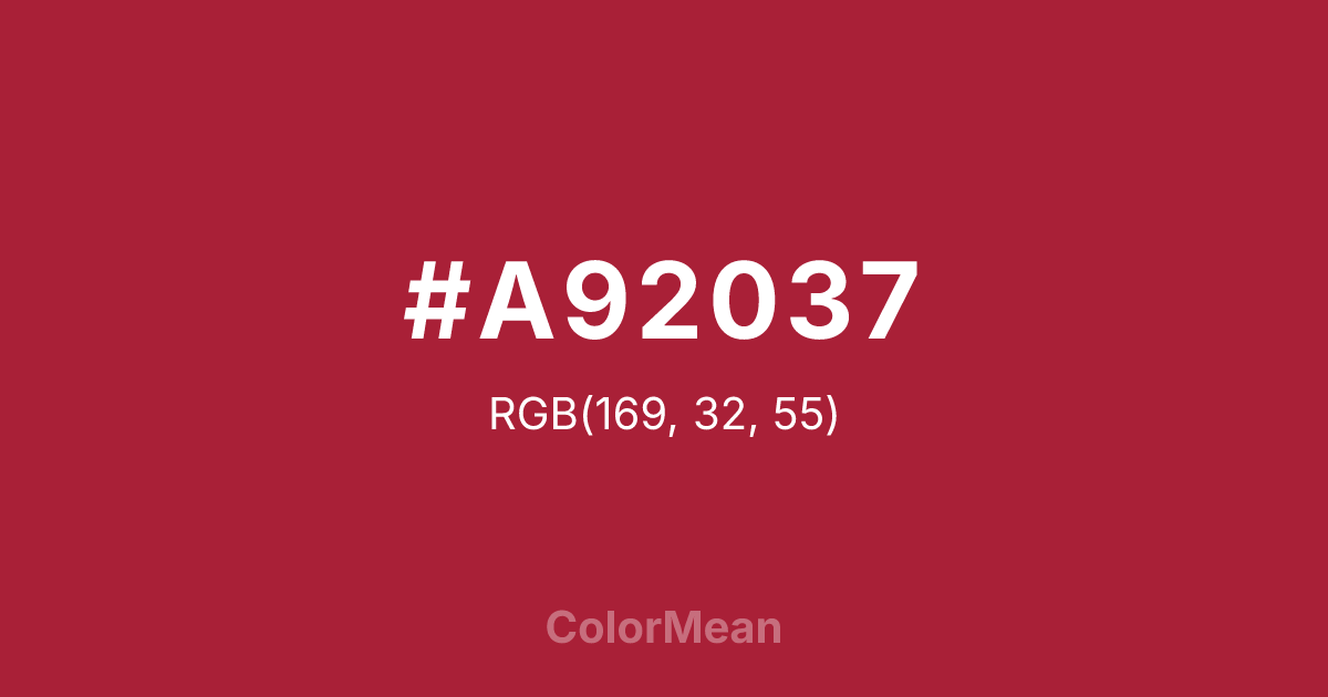 #A92037 RGB value is (169, 32, 55). The hex color red value is 169, green is 32, and blue is 55. Its HSL format shows a hue of 350°, saturation of 68 percent, and lightness of 39 percent. The CMYK process values are 0 percent, 81 percent, 67 percent, 34 percent.