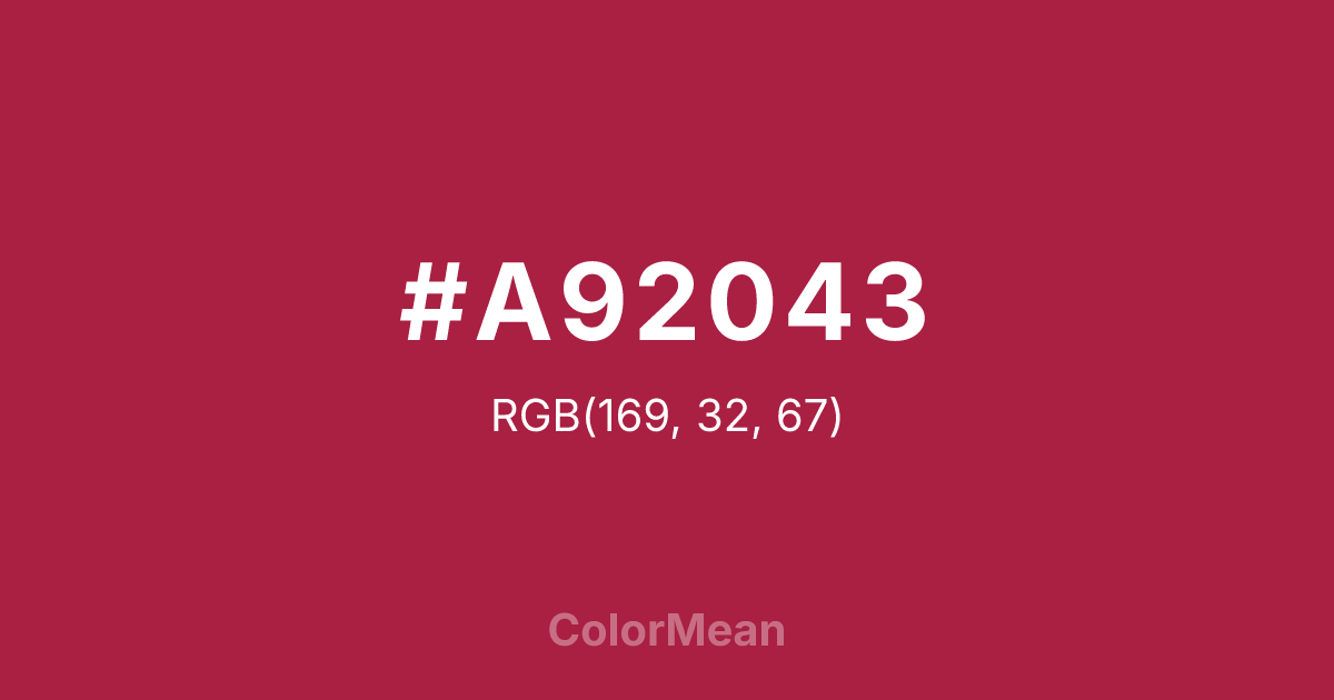 #A92043 RGB value is (169, 32, 67). The hex color red value is 169, green is 32, and blue is 67. Its HSL format shows a hue of 345°, saturation of 68 percent, and lightness of 39 percent. The CMYK process values are 0 percent, 81 percent, 60 percent, 34 percent.