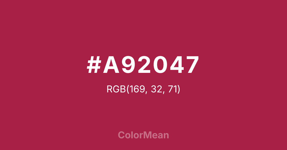 #A92047 RGB value is (169, 32, 71). The hex color red value is 169, green is 32, and blue is 71. Its HSL format shows a hue of 343°, saturation of 68 percent, and lightness of 39 percent. The CMYK process values are 0 percent, 81 percent, 58 percent, 34 percent.
