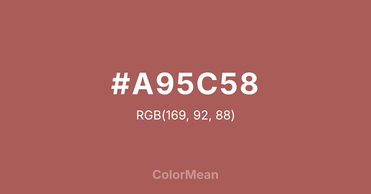 #A95C58 RGB value is (169, 92, 88). The hex color red value is 169, green is 92, and blue is 88. Its HSL format shows a hue of 3°, saturation of 32 percent, and lightness of 50 percent. The CMYK process values are 0 percent, 46 percent, 48 percent, 34 percent.