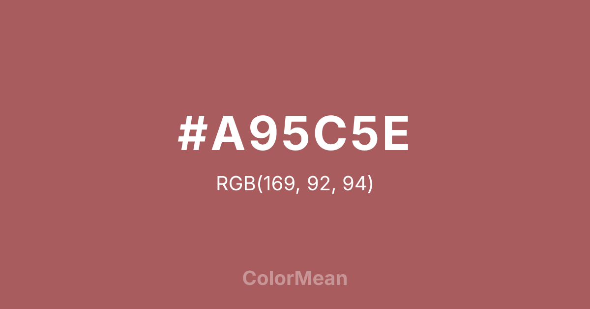 #A95C5E RGB value is (169, 92, 94). The hex color red value is 169, green is 92, and blue is 94. Its HSL format shows a hue of 358°, saturation of 31 percent, and lightness of 51 percent. The CMYK process values are 0 percent, 46 percent, 44 percent, 34 percent.