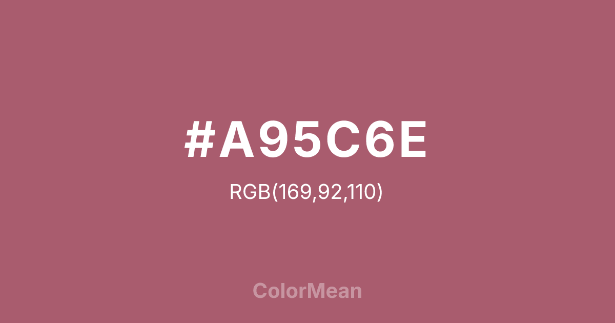 #A95C6E RGB value is (169, 92, 110). The hex color red value is 169, green is 92, and blue is 110. Its HSL format shows a hue of 346°, saturation of 31 percent, and lightness of 51 percent. The CMYK process values are 0 percent, 46 percent, 35 percent, 34 percent.