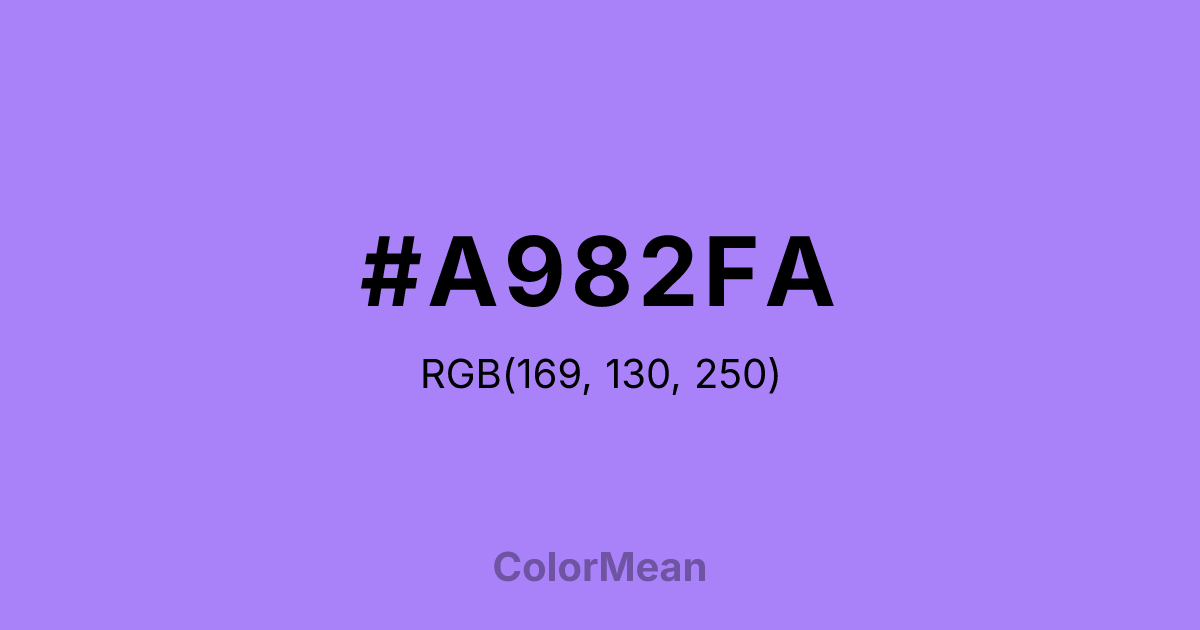 #A982FA RGB value is (169, 130, 250). The hex color red value is 169, green is 130, and blue is 250. Its HSL format shows a hue of 260°, saturation of 92 percent, and lightness of 75 percent. The CMYK process values are 32 percent, 48 percent, 0 percent, 2 percent.